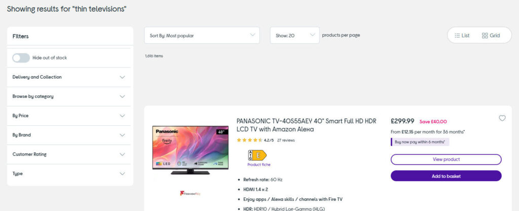 Look at this example for ‘thin televisions’ we conducted on Curry’s website. There is a host of relevant filtering options you can choose from. Amazing…well wait. There’s a twist. We couldn’t open those filtering blades and select anything. With 1,600+ results you might want to narrow it down slightly!