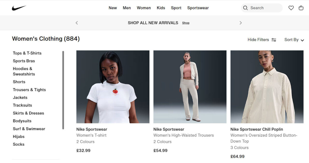Nike is a perfect example of a professional side menu, and it lets users filter their search, instead of clicking on multiple pages to find a product.