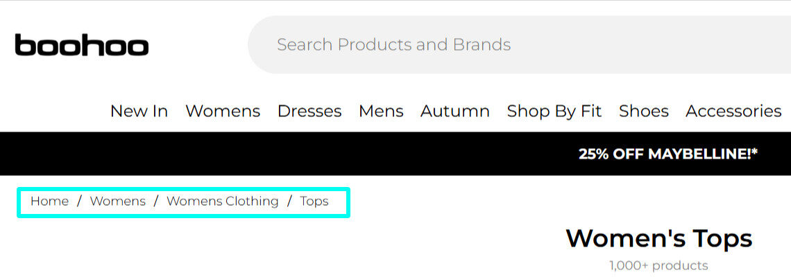 Boohoo is an excellent example of proper breadcrumb use, as visitors can easily navigate from women’s tops back to the main clothing category and homepage.