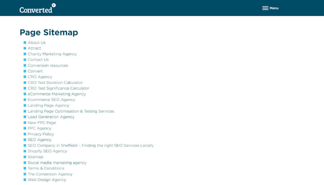 It’s always a good idea to submit your XML sitemap to Google Search Console and repeat the process when you make changes to the content. You could also create an HTML sitemap and add it to your footer to ensure that website visitors can find the pages they’re looking for, as you can see from the Converted sitemap: