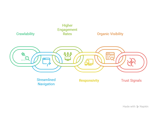 - – Crawlability: Search engines need to crawl and understand your website to rank it. Having a clear site structure makes it easier for the search engines to understand your content, index it, and rank the website accordingly.