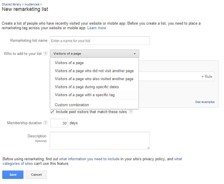 You can then go on to create more remarketing lists based on certain rules or create lists that are a custom combination (these can be a combination of both rule-based lists and tag-based lists). You can create as many lists as you like based on the sections of your website that people visit. To make the most of Remarketing Lists for Search Ads it is a must that you create some more refined lists of visitors, that way you will be able to fully tailor your ads and optimise your bids correctly.