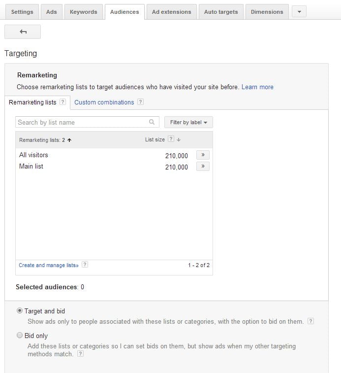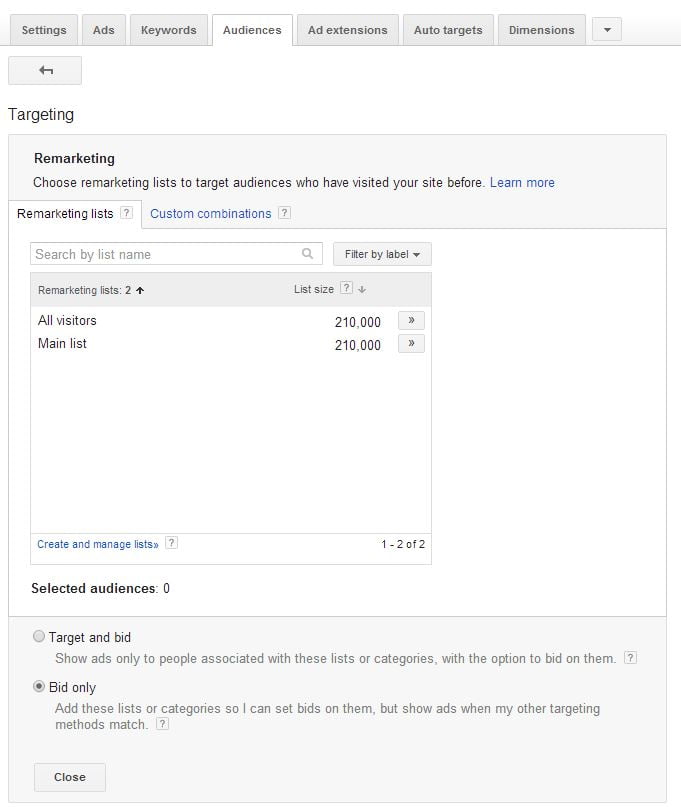After this or if you already have all this set up then you have two choices. Your first option is something called ‘Bid-Only’. ‘Bid-Only’ allows you to make adjustments to pre-existing campaigns. With ‘Bid-Only’ you add audiences to campaigns; however your ads will continue to show to users who are not in any of your lists. ‘Bid-Only’, much like mobile and location bid adjustments, enables you to bid higher for those people in your RLSAs. This option holds a lot of value and management efficiencies, as well as being easier to implement, but you will not get as much optimisation as you will with the second option. To get started with this you will need to select any of your currently enabled search network campaigns and click into an ad group. Then click into the ‘Audiences’ tab and you will see the option to ‘+ REMAKRETING’. If you then select ‘Targeting’ and then ‘Remarketing’ your available lists will appear. After selecting your lists you will need to make sure you select ‘Bid-Only’.