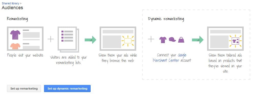 Very briefly to do this you need to go to the shared library of your account on the left hand side of the platform. Then navigate to the audiences tab (also on the left side of the platform) and select the option that states ‘Set-up remarketing’. You will then be guided into emailing the relevant person the set-up details. These details include a tag to be placed before the closing </body> tag on every page of your site. Additional technical instructions are included in the email itself. This ‘tag’ or code will tell Adwords to add every visitor to your site to your new list. This is how you will begin to build up a list of cookies. When someone visits a page on your site all the cookies associated with their browsers are added to your remarketing list. For your remarketing list to be useable on search ads you will need to build up a minimum of 1000 cookies. (This is so the privacy of your users is protected). When all this is completed you will have created your first ‘audience’ which will be entitled ‘All Visitors’.