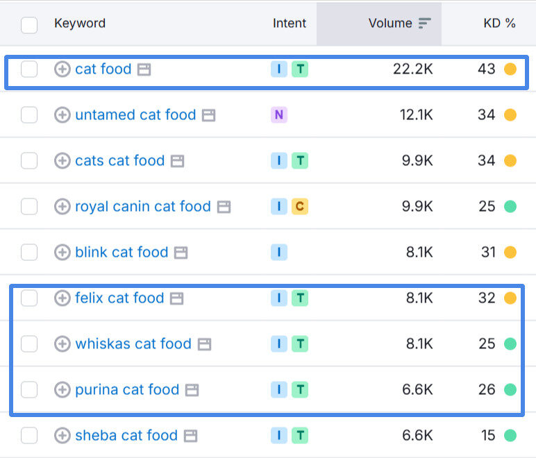 For example, a popular term like “cat food” has a medium difficulty rating, but adding long tail phrases or brand names significantly reduces the competition levels.
