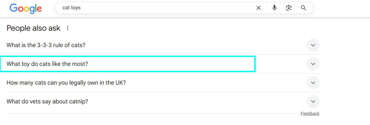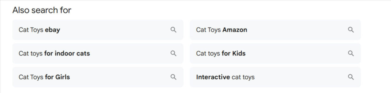 As you can see from these examples, a search for cat toys provides some valuable keyword ideas, and you should add them to your Ecommerce SEO strategy.